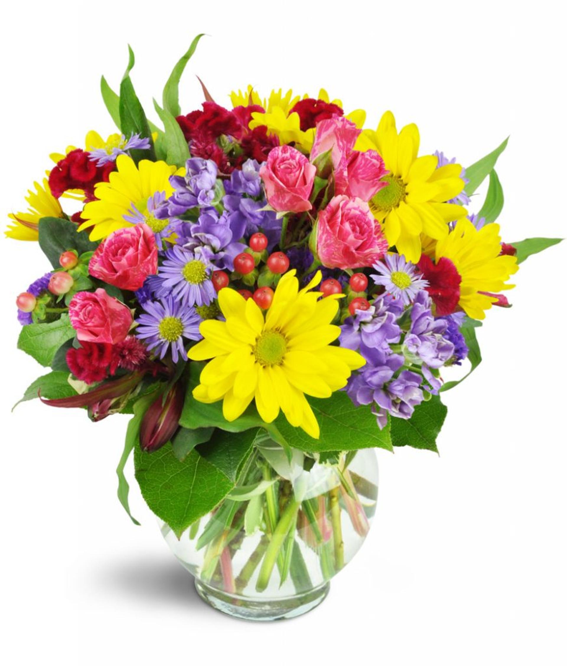 Cheery yellow daisies, purple asters, pink spray roses, and more are delightfully arranged in a fun bubble bowl.