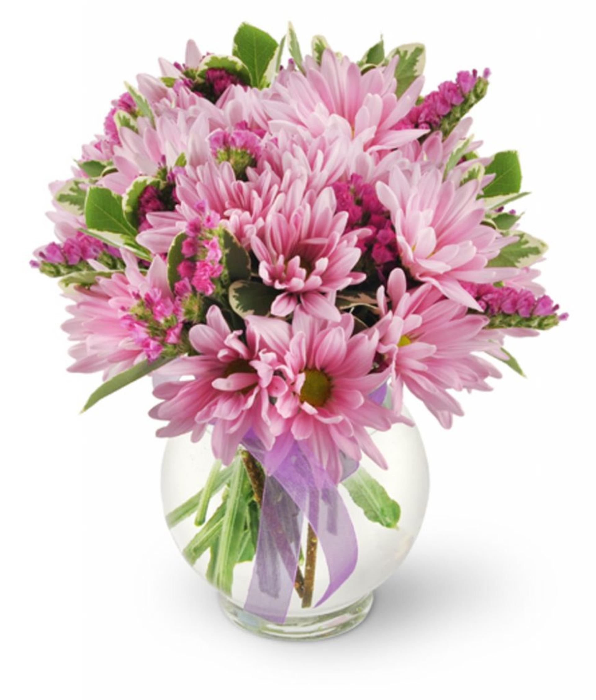 For anyone who loves pink and purple hues, our Happy Thoughts bouquet is a match made in heaven! A bundle of darling daisies mixes delightfully with sweet statice to create a melodic symphony of tones!