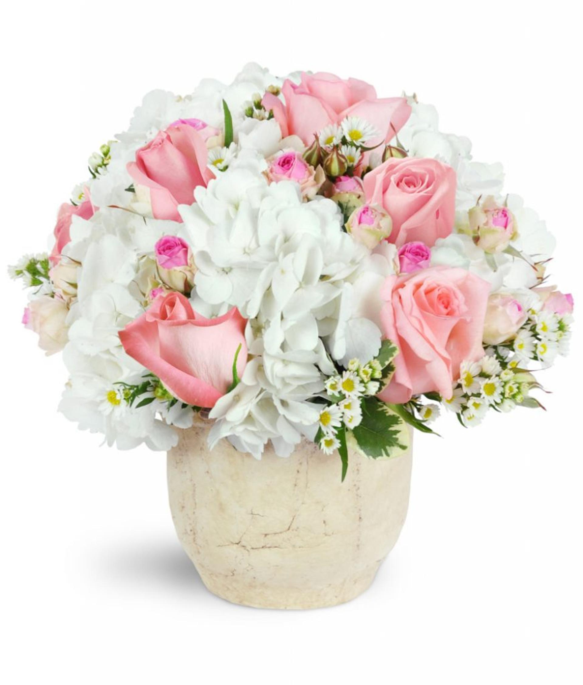 White hydrangea and light pink roses, mixed with precious pink spray roses, create an enchanting display in a planter.