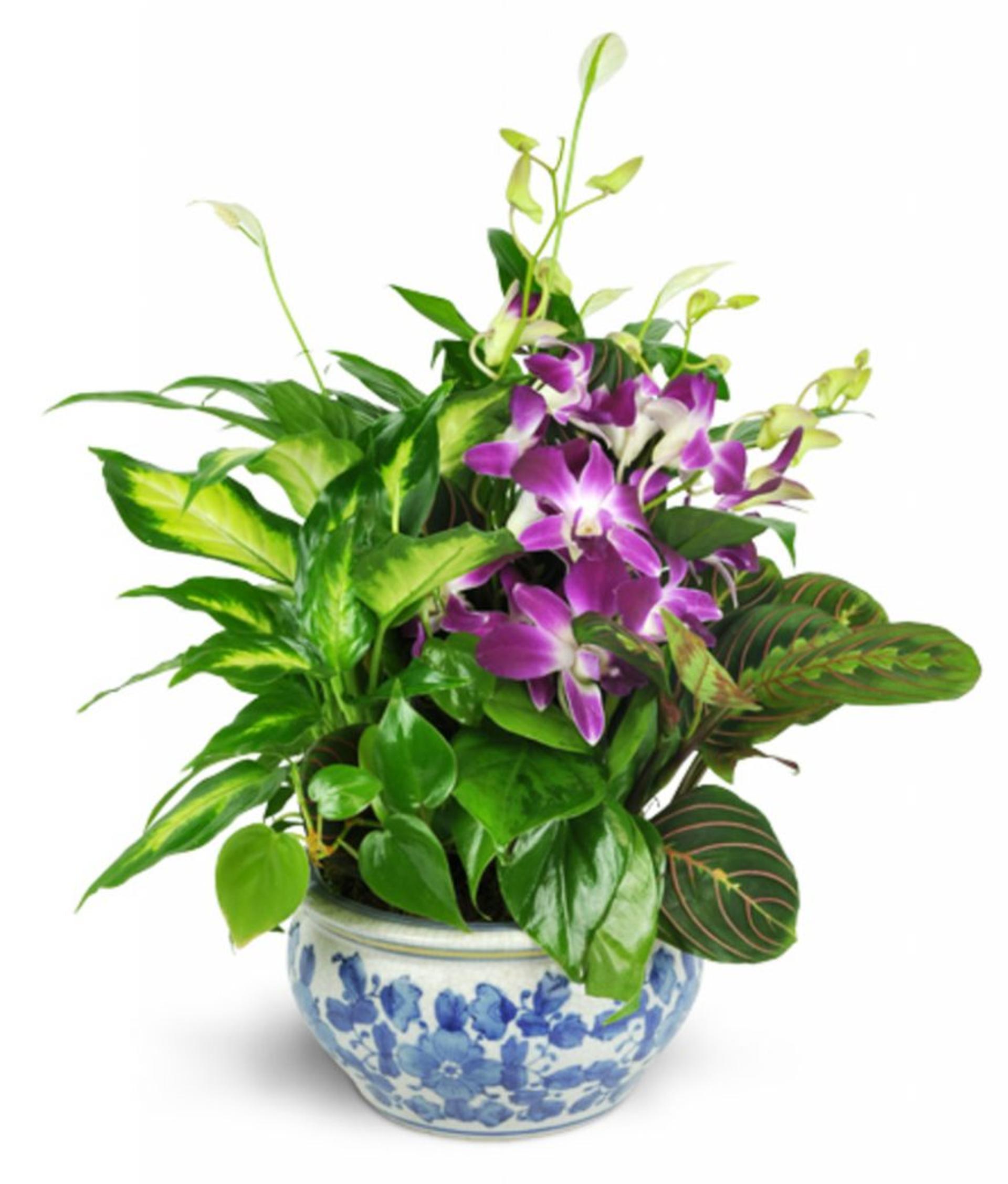 Three green plants are arranged with fresh-cut dendrobium orchids in a lovely planter.